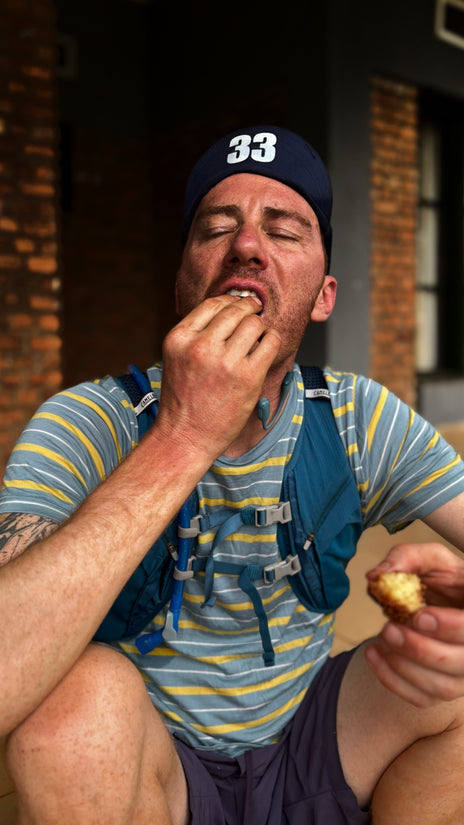 Muzungu betekent buitenlander, reiziger, blanke man. Deze man spendeerde ongelooflijk veel energie op zijn kleinere wielen - en voedsel was schaars. Afgebeeld: ontbijt op dag 2, zijn eerste hap echt eten sinds de lunch de dag ervoor!