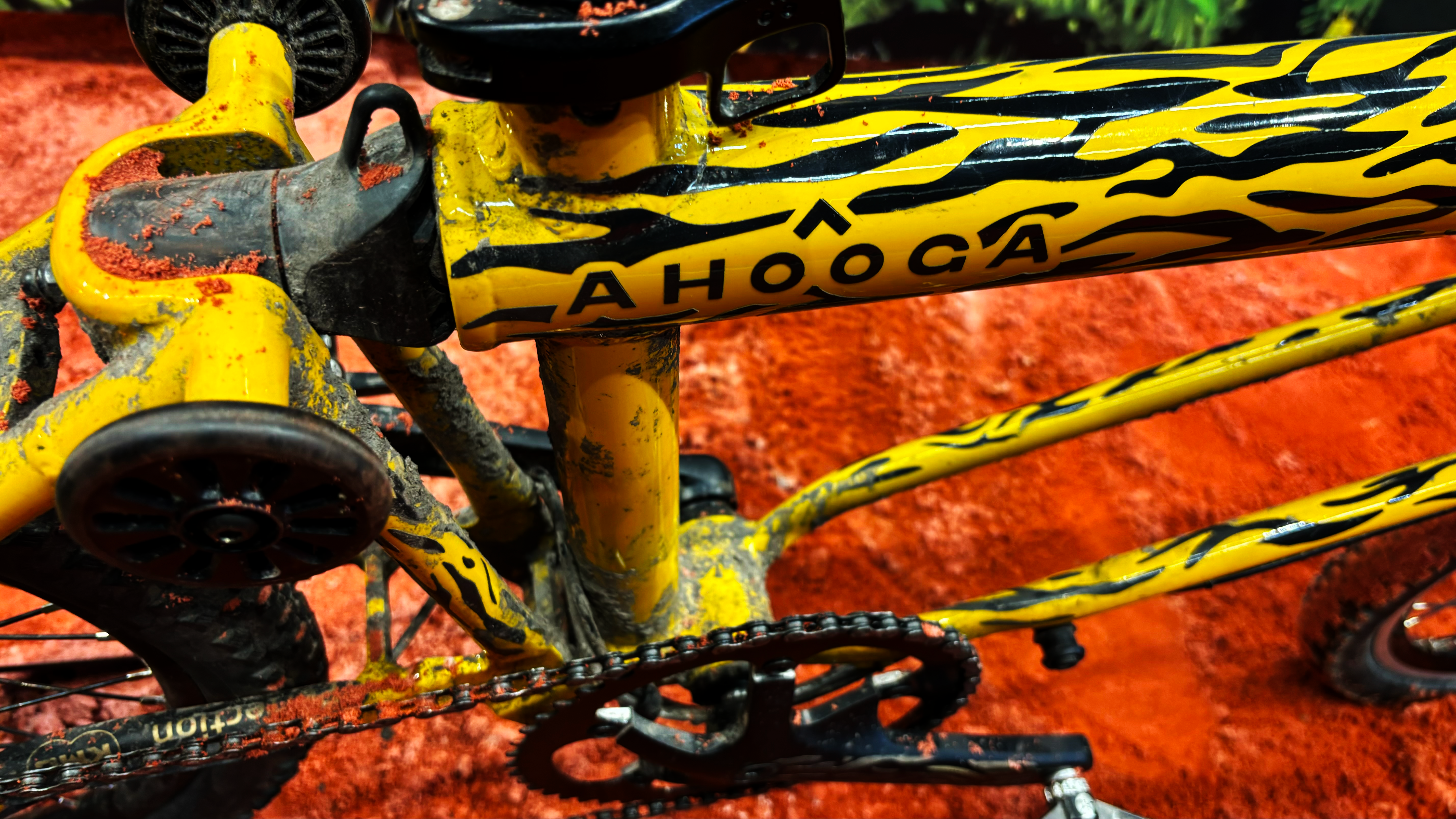 Stuart rijdt op een A-MAX. Het is hetzelfde frame dat commercieel verkrijgbaar is, maar premiummerken hebben zich bij het project aangesloten om de fiets meer duurzaamheidsvriendelijk te maken.