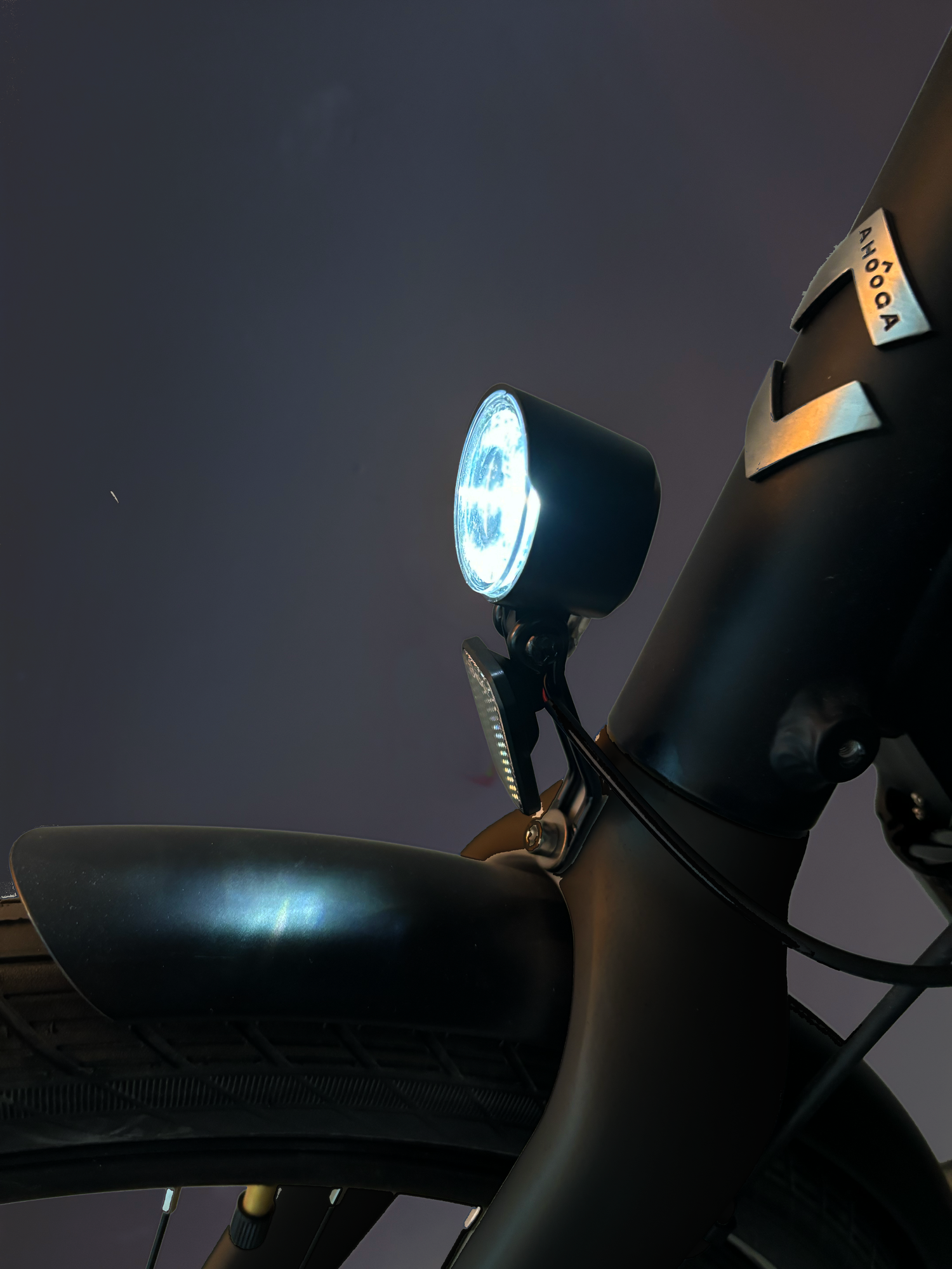 Spanninga Arco lampen (80-30 lumen voor/achter) . Met deze lampen is de rit makkelijker en veiliger.